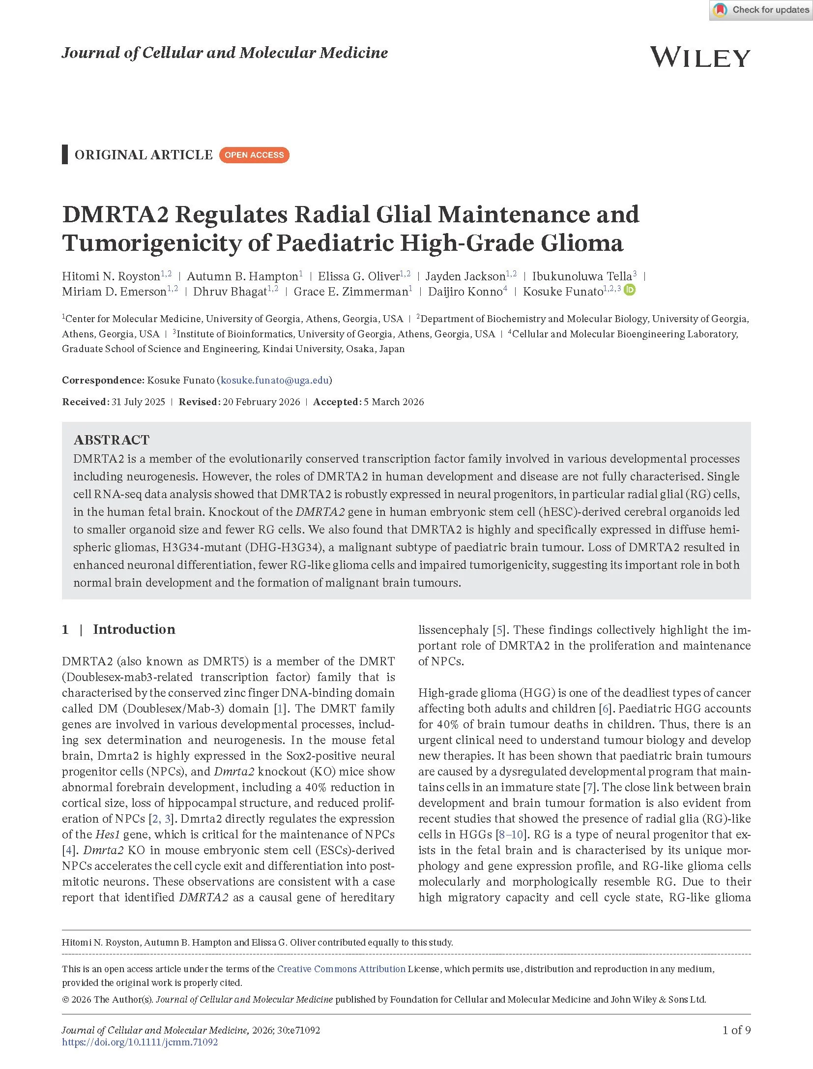 Royston HN, Hampton AB, Oliver EG, Jackson J, T Ibukunoluwa, Emerson MD, Bhagat D, Zimmerman GE, Konno D, Funato K. DMRTA2 regulates radial glial maintenance and tumorigenicity of pediatric high-grade glioma. Journal of Cellular and Molecular Medicine 2026; 30(6):e71092 [Link]