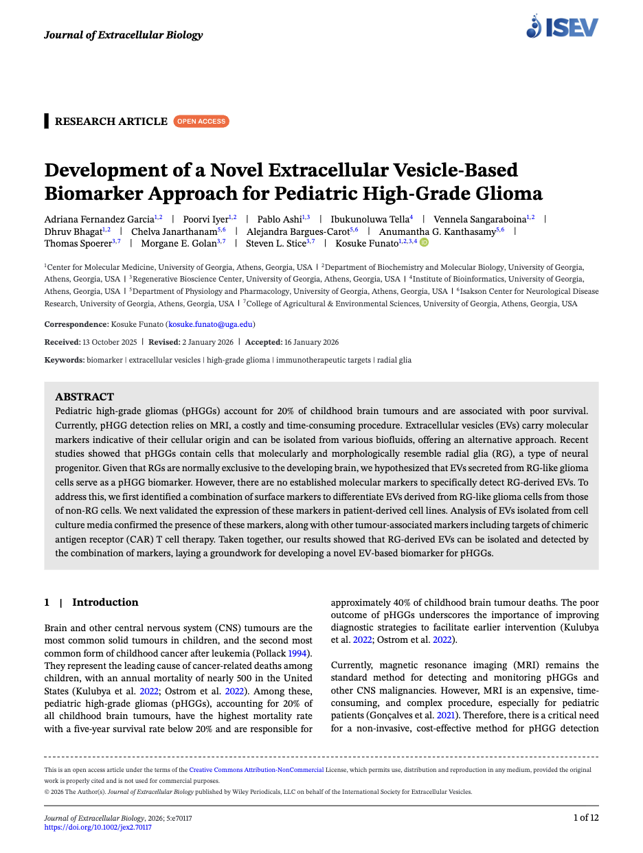 Fernandez Garcia A, Iyer P, Ashi P, Tella I, Sangaraboina V, Bhagat D, Janarthanam C, Bargues-Carot A, Kanthasamy AG, Spoerer T, Golan ME, Stice SL, Funato K. Development of a Novel Extracellular Vesicle-Based Biomarker Approach for Pediatric High-Grade Glioma. J Extracell Biol. 2026; 5(2):e70117 [Link]